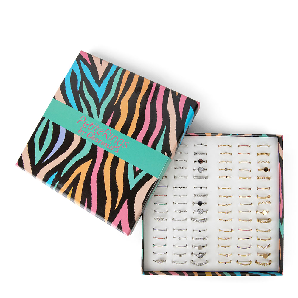 - Een mix van gouden en stalen Petite ringen in de maten 14, 15 en 16.