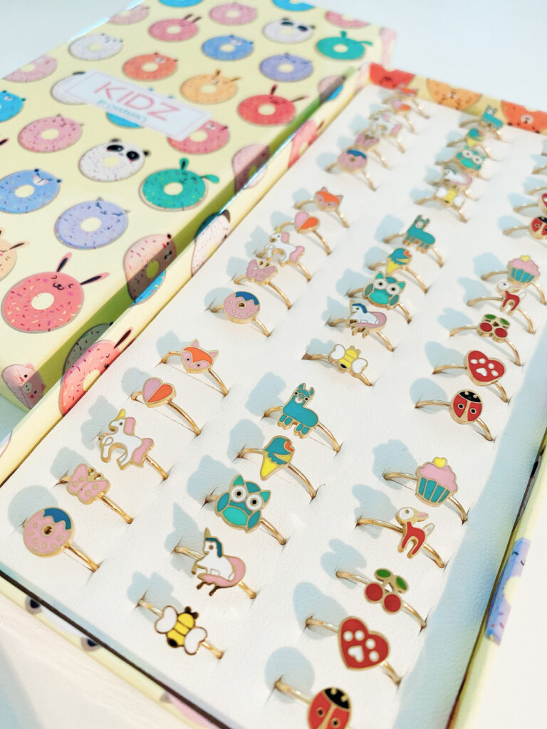 Super schattige dunne stalen gouden ringetjes met leuke figuurtjes ingekleurd met de hand met emaille, deze ringen worden ready-to-go (alle ringen zitten al in het doosje) in een cute display geleverd.