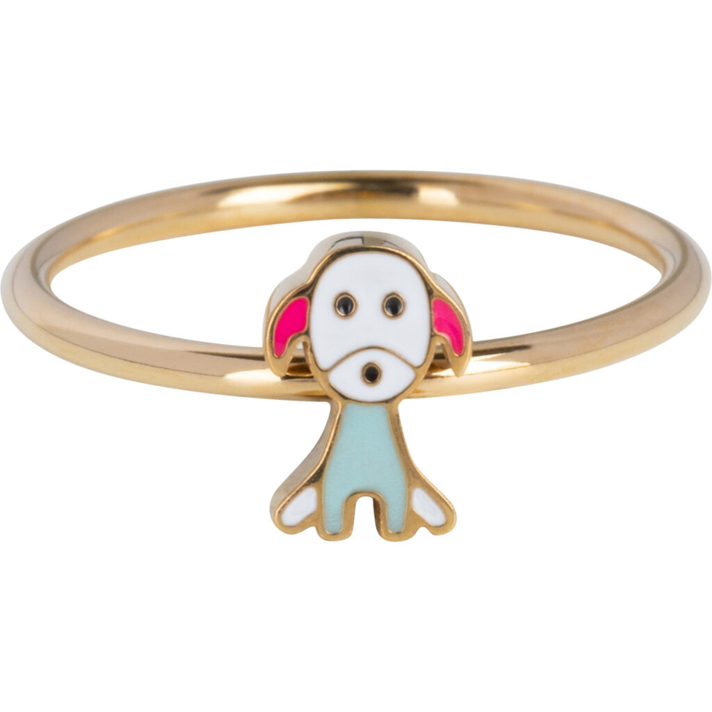 Deze schattige KIDZ kinderring in goudkleurig staal toont een lief, braaf zittend hondje, gekleurd met emaille.