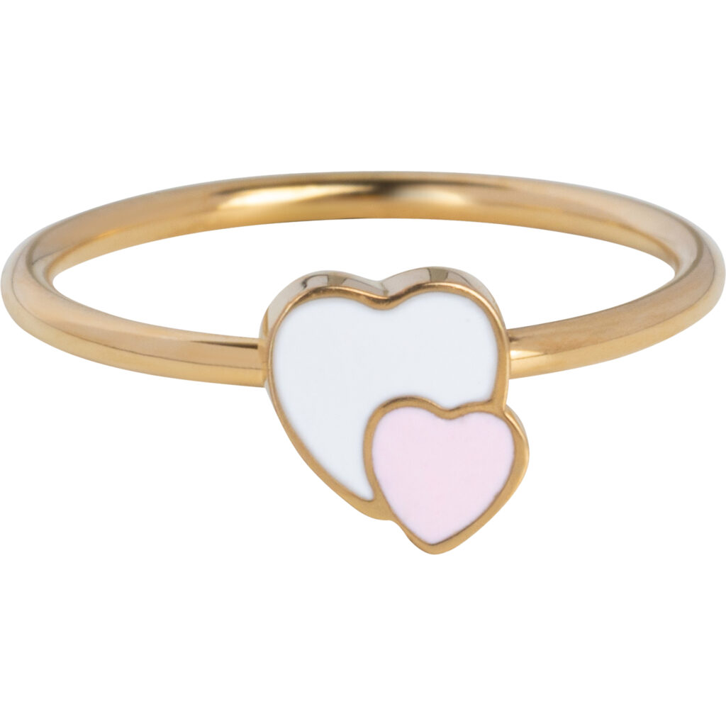 Deze lieve KIDZ kinderring in goudkleurig staal heeft twee subtiele hartjes in wit en roze. Een tijdloos en speels sieraad vol charme.