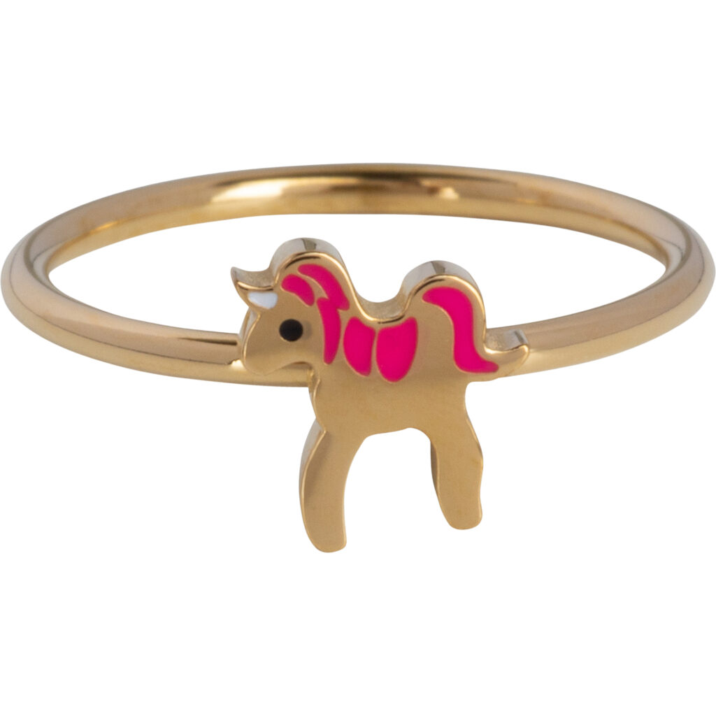 Deze prachtige KIDZ kinderring in goudkleurig staal heeft een klassiek vormgegeven paardje met roze geëmailleerde manen.