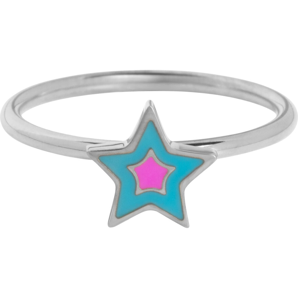 Deze sprankelende KIDZ kinderring van staal is een vrolijk sterretje met fel roze en blauw emaille. Ook mooi als symbool voor sterretjes in de hemel.