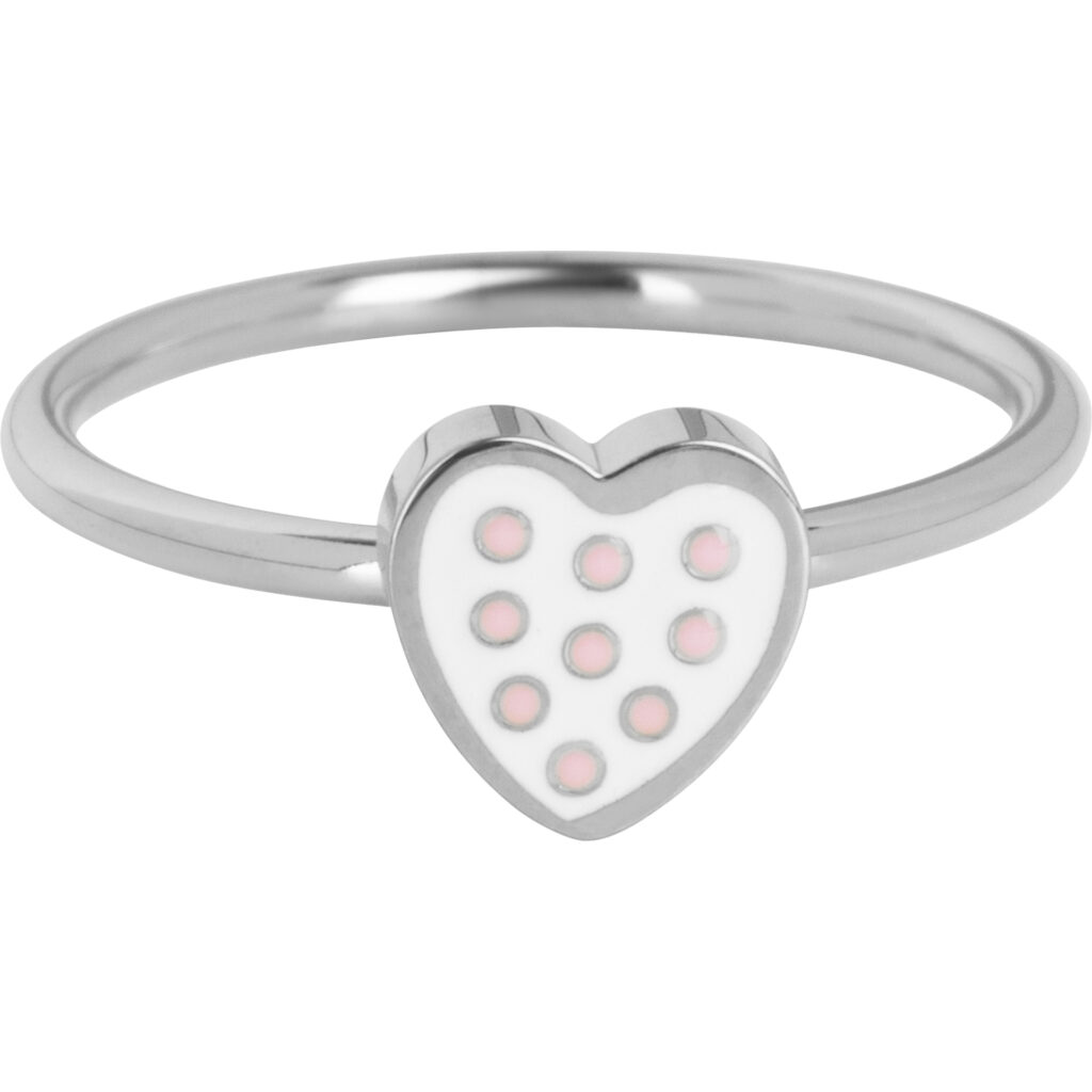 Deze schattige KIDZ kinderring in staal heeft een hartje met wit emaille en subtiele zachtroze stippen. Een sierlijk en speels ontwerp voor kleine prinsessen.