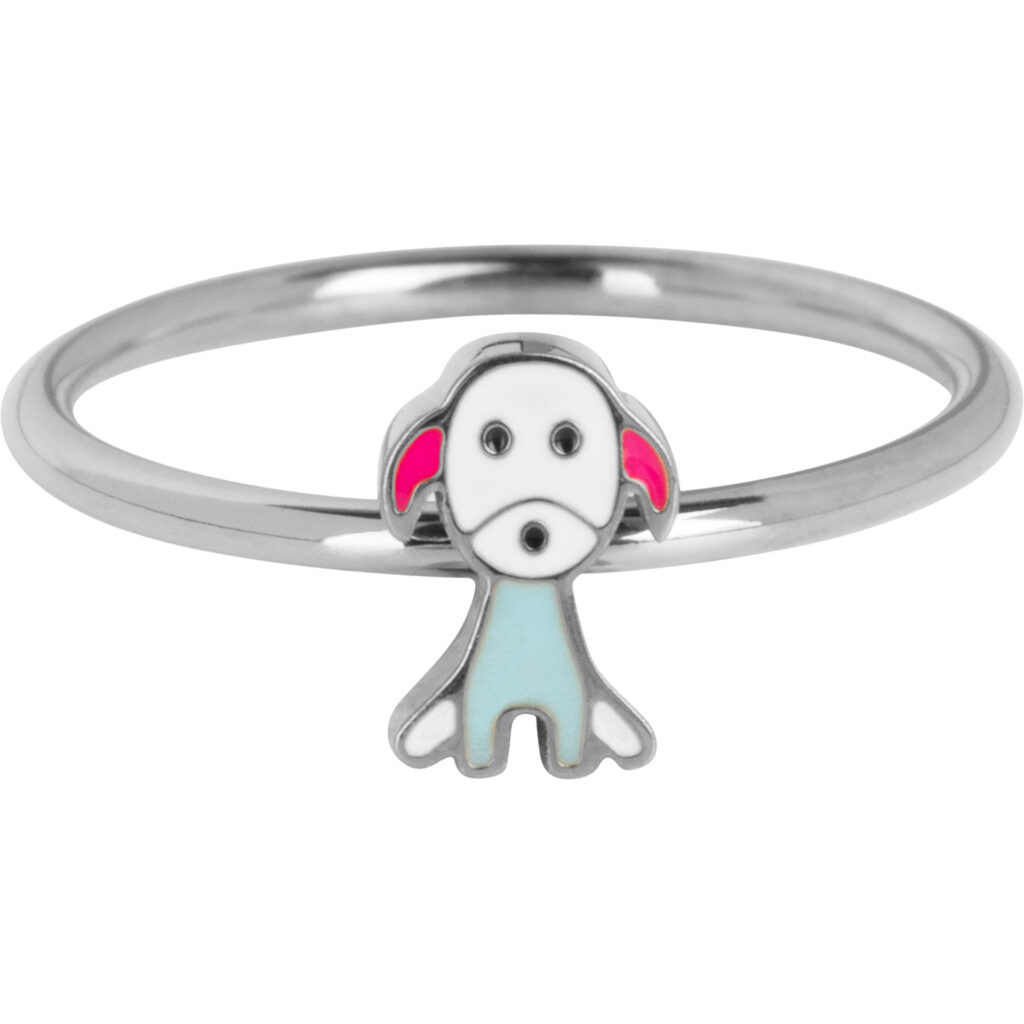 Deze schattige KIDZ kinderring in staal toont een lief, braaf zittend hondje, gekleurd met emaille.