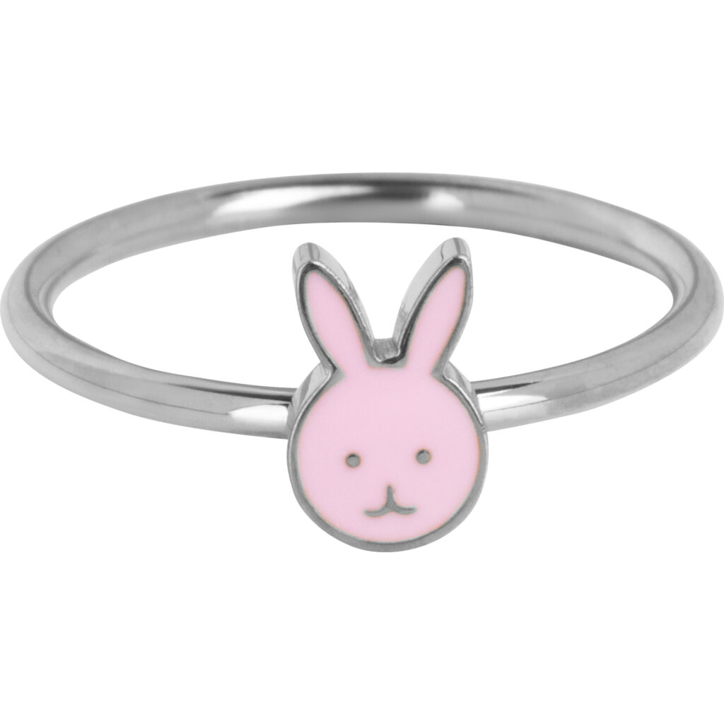 Deze kinderring van staal heeft een prachtig, minimalistisch ontwerp met het hoofdje van een schattig konijntje. Het figuurtje, in zachtroze emaille, straalt eenvoud en charme uit, geïnspireerd door een tijdloze vintage stijl.