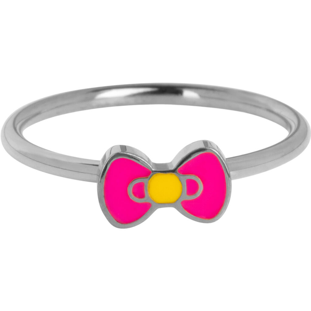 Deze vrolijke KIDZ kinderring in staal is een echte blikvanger dankzij het roze strikje met een gele binnenkant.