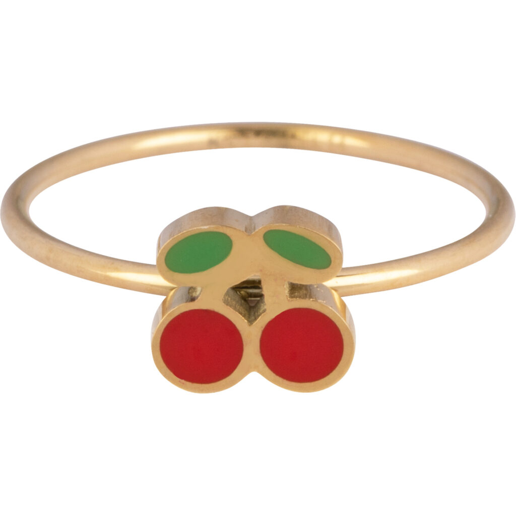 Kidz By Charmins is een sieradenlijn speciaal ontworpen voor kinderen! De ringen zijn gemaakt van 316L chirurgische edelstaal met een IP plating van goud en hebben een schattig applicatietje van emaille. De ring is 1 * 1 mm, de kersjes zijn 5,5 * 6 mm. Verkrijgbaar in de maten 13, 14 en 15mm.