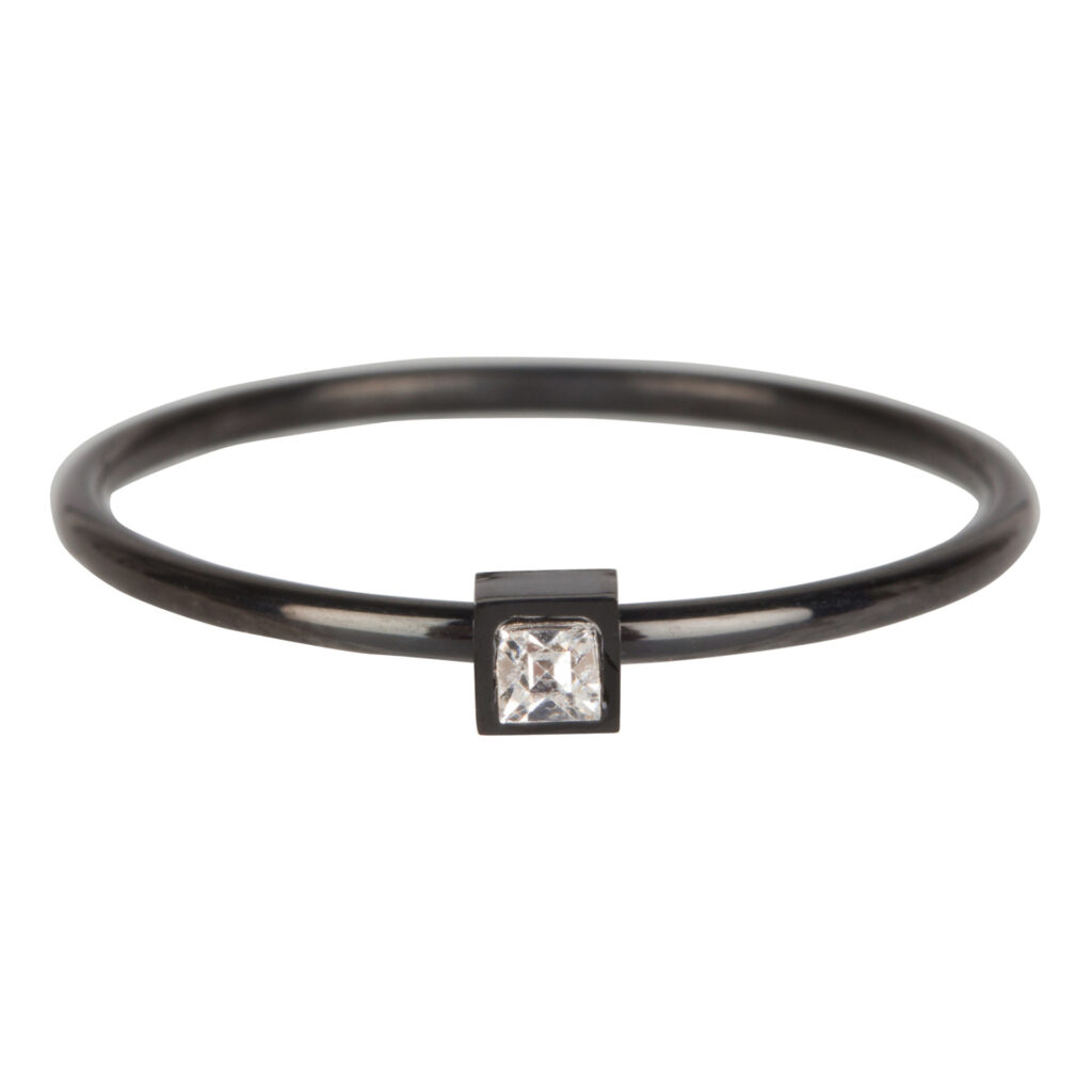 Stalen minimalistische stapelring  "R503 Stylish Square black Steel Crystal CZ" van het fashion sieradenmerk Charmin’s. Ronde ring van 1mm versierd met vierkant kastje wat een vierkant crystal-kleurige zirkoon laat schitteren.