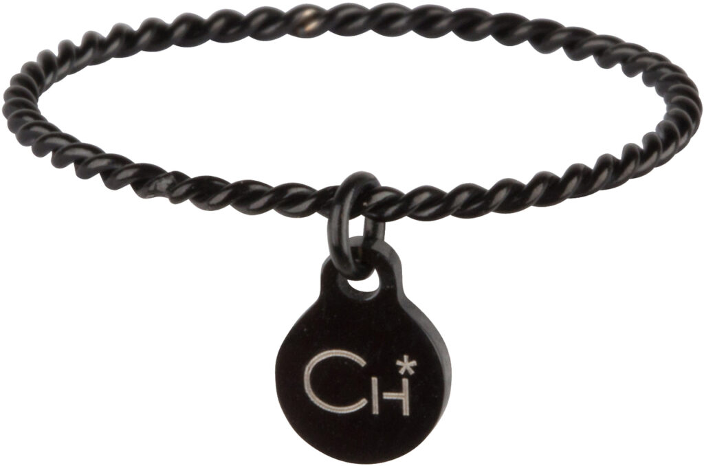 Stalen minimalistische (stapel)ring   "R571 Dangling Coin Black Steel"  bestaande uit een ring van gedraaid staal van 1 mm dik, versierd met een muntje bewerkt met CH* logo. Het muntje is met een gesoldeerd ringetje bevestigd.