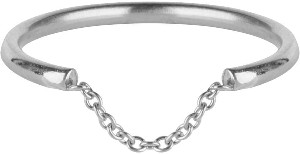 Stalen minimalistische (stapel)ring "R572 Chained Shiny Steel", rond afgewerkte ring met diameter 1,5mm met een opening van 1cm waaraan een stijlvol kettingkje bevestigd is.