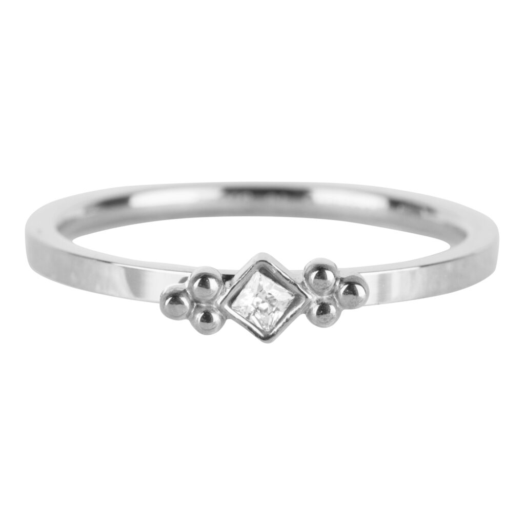 Stalen stapelring van het fashion sieradenmerk Charmin’s. Draag deze ring los of met meerdere ringen samen. Maak jouw eigen unieke combinatie. 1,5 mm breed en hoog. Versierd met een vierkante crsytal kleurige zikonia.