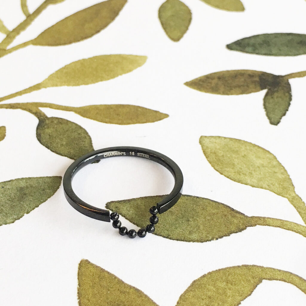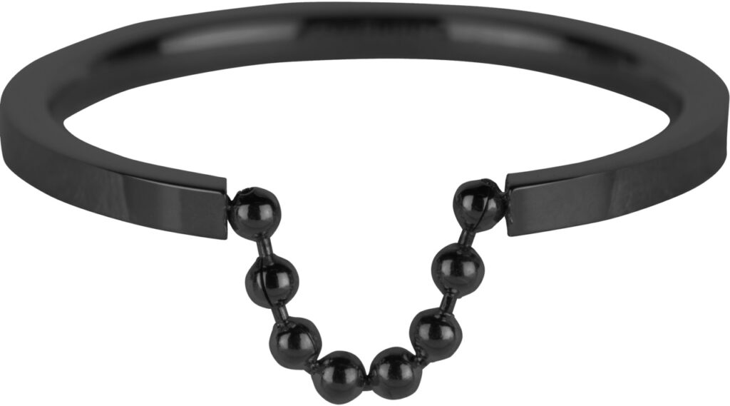 Stalen minimalistische (stapel)ring "R623 Shackle Black Steel", rond afgewerkte ring met diameter 1,5mm met een opening van 1cm waar aan een stijlvol kettingkje bevestigd is. Ideaal om te combineren met ring R488.