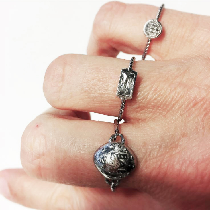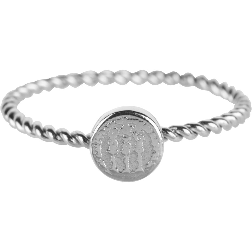 Stalen stapelring ook te dragen als zegel ring “R626 Shiny Steel Historic Coin” van het fashion sieradenmerk Charmin’s. Gerdaaid 316L staal met een diameter van 1,5mm met daarop een munt.