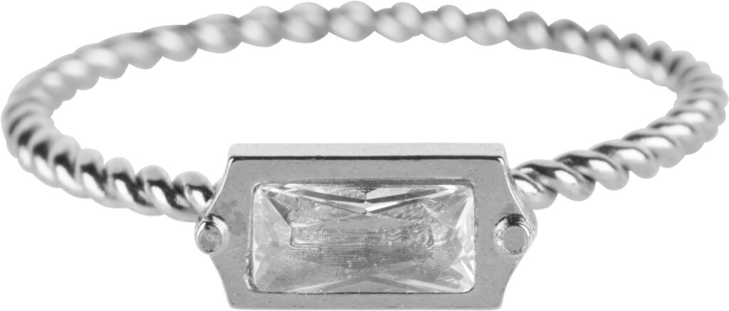 Stalen stapelring “R631 Turned Shiny Steel Rectangle Crystal CZ” van het fashion sieradenmerk Charmin’s. De ring zelf heeft een diameter van 1mm. Op de ring zit een kuipje met daarin een zwarte zirkon
