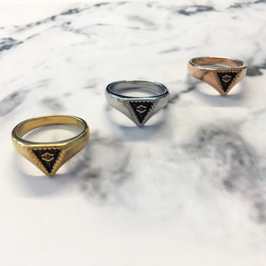 Stalen zegelring “R677 Eye Triangle Gold Steel” van het fashion sieradenmerk Charmin’s.