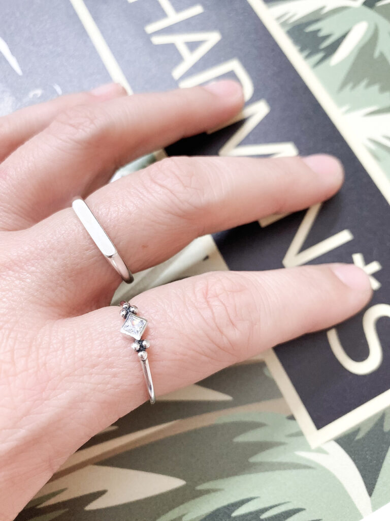 Zilveren stapelring “R758 Silver Ornaments Black Crystal” van het fashion sieradenmerk Charmin’s. De ring zelf heeft een diameter van 1,5mm en is geheel gemaakt van 925 sterling zilver.