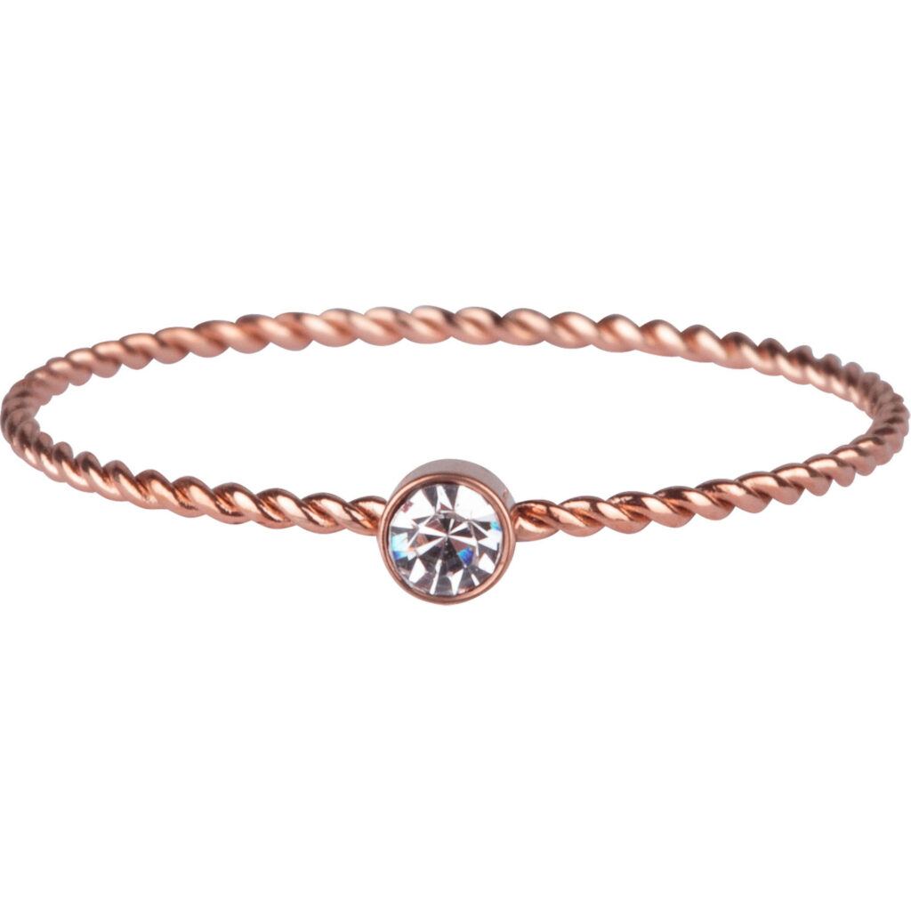 Stalen stapelring “R946 Shine Bright Twisted Rosegoud-kleurig and white crystal” van het fashion sieradenmerk Charmin’s. Maat 18 valt iets groter uit.