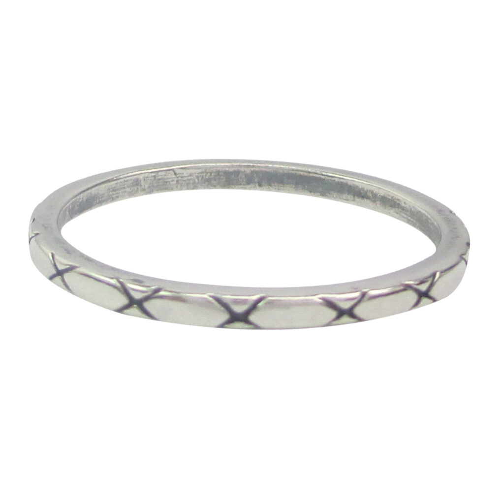 Zilveren stapelring met kleine lieve kruisjes/ kusjes erop “R004 X-Type” van het fashion sieradenmerk Charmin’s.