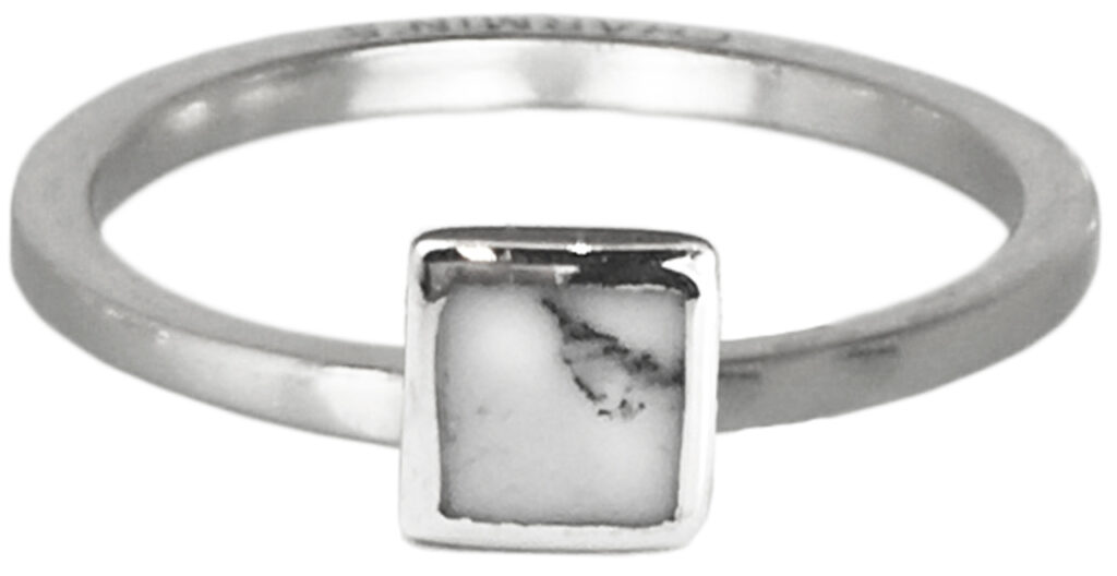 Zilveren met vierkantje ingelegd met marmer stapelring “R409 Silver Marble Square Stud” van het fashion sieradenmerk Charmin’s.