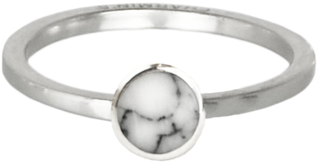 Rond marmeren steentje op een gladde zilveren stapelring “R410 Silver Marble Round Stud” van het fashion sieradenmerk Charmin’s.